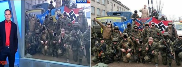 Petros uncovered one such manipulation last year. A member of the now famous Ukrainian Azov battalion, whose members undoubtedly do include fascists, had posted a photo of his battalion posing with a Swastika flag. Petros proved it was a photoshopped fake, the original had no Nazi flag in it. Nevertheless here it was on Russian primetime TV news …