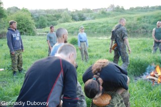 Another prominent Russian fascist in the Donbas is Gennadiy Dubovoy, whose colleagues are shown in the top and left photos participating in some sort of bizarre Nazi ritual. (See lots more whacky photos.)
