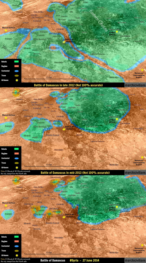 The old regime fought to crush the uprising and disintegrated amid defections of its troops and officials throughout 2011 and 2012 thereby creating a ‘new’ regime. Regime 2.0 is a leaner, meaner, defection-free killing machine whose war-fighting is characterized by strategic vision, methodical prioritization, and a disciplined command structure steady enough to guide campaigns over weeks and months to victory. Whereas regime 1.0 fought to obliterate the uprising in all areas at once, regime 2.0 picks and chooses its offensives and seeks to buy ever-more time to gain ever-more advantages over the rebels. Its military strategy is to hold onto the cities, highways, and airbases — even at the cost of leaving the suburbs and the countryside to the rebels — while organizing a series of strategic offensives to clear the core of the country (stretching from Daraa to Aleppo) of rebel fighters, forcing them to the periphery and reducing their status from major threat to manageable nuisance. Its political strategy is to prevent opposition forces from gaining popularity. This is accomplished through two mechanisms: make the price of defying the regime so high that no city or large town will dare join the revolution of its own volition and make governance (let alone good governance) in liberated areas impossible. The emergence of free Syrian territories where the hungry are fed, the sick are cared for, and where law and order prevail without a massive apparatus of torture and terror would threaten the reluctant, grudging support people give the regime as a lesser or necessary evil. This two-fold political strategy is why the regime relentlessly attacks targets of no military value like hospitals, bakeries, and schools while airstrikes on the Islamic State (formerly ISIS/ISL, known pejoratively as Daesh) have been rare (see below) up until recently.