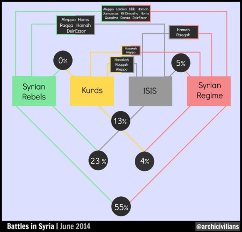 However, Daesh is not invincible; it has strong and weak points (or in other words, contradictions) just as its enemies do. Daesh’s weak points are less serious than those of rebel and regime forces and it has far more strong points than weak points compared to both of them which is why Daesh can beat them (and its Iraqi enemies) on many fronts simultaneously.