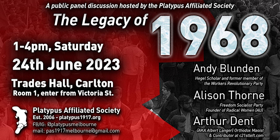 On June 24, 2023 at Trades Hall in Melbourne, Australia, the Platypus Affiliated Society hosted a panel on the legacy of 1968.[1] The speakers included Andy Blunden, Alison Thorne, and Arthur Dent. Barry York provides his response to the panel.